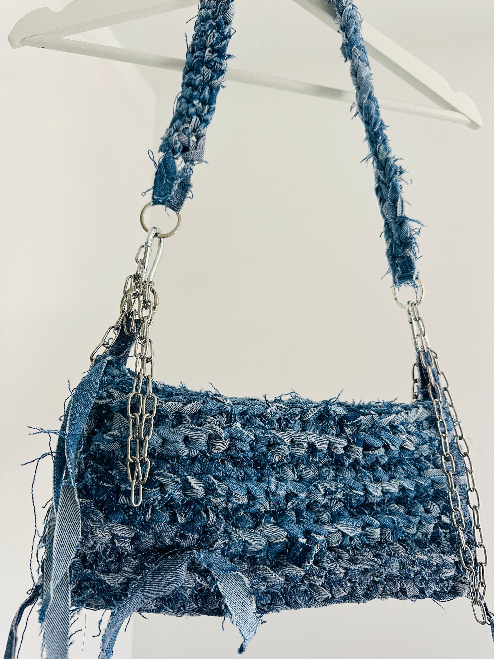 A pair of jeans, reimagined just for you. This bespoke, made-to-order bag is hand crocheted from upcycled denim, embracing the raw, frayed edges to create a unique and edgy statement piece with a story. Due to the nature of the strap, this bag can be work as a shoulder bag, cross-body bag or remove the strap for a hip clutch.