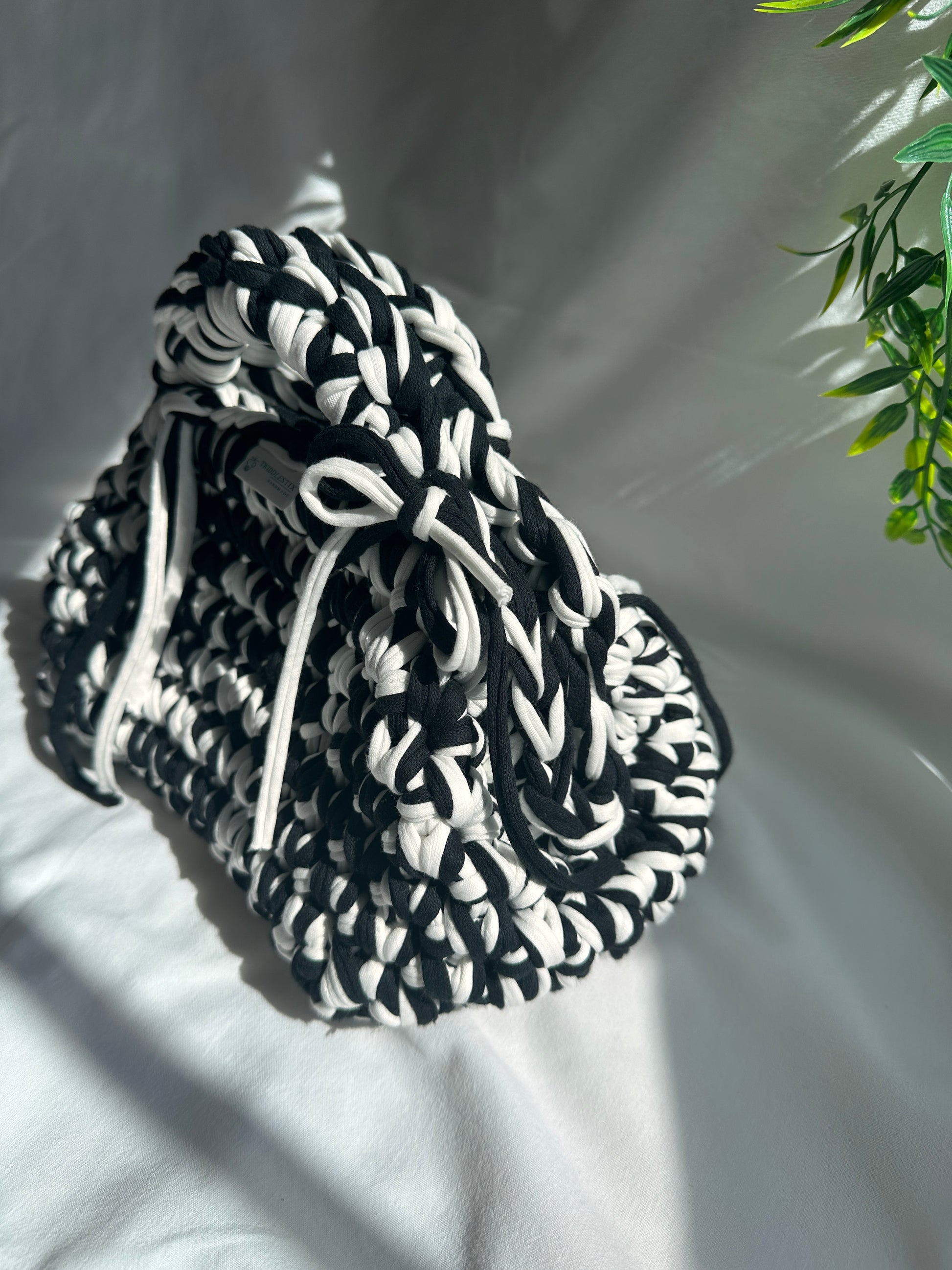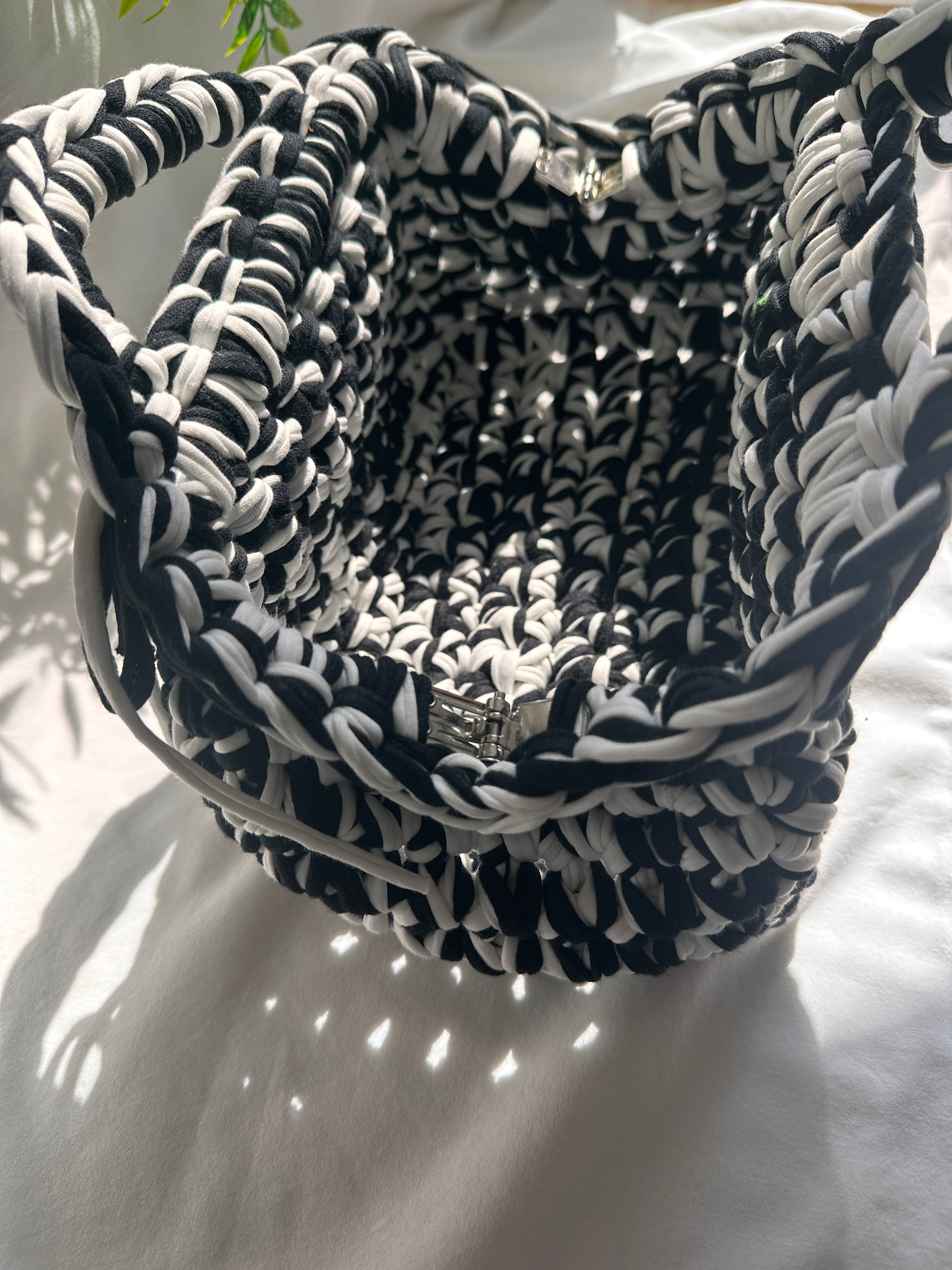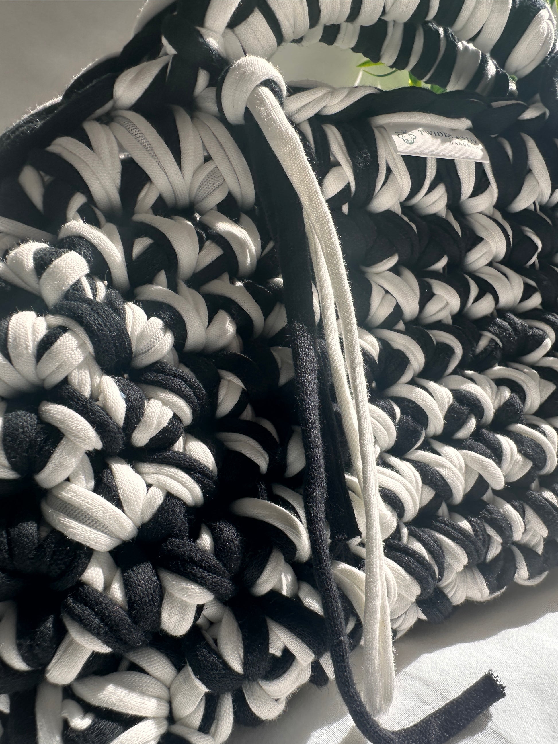 Step into the spotlight with our striking Monochrome Magic Clutch! This isn't just a bag; it's a statement piece that blends bold contrast with eco-conscious craftsmanship. Lovingly handmade from soft, recycled t-shirt yarn in a classic black and white palette, this clutch exudes modern elegance with a unique, textural twist.