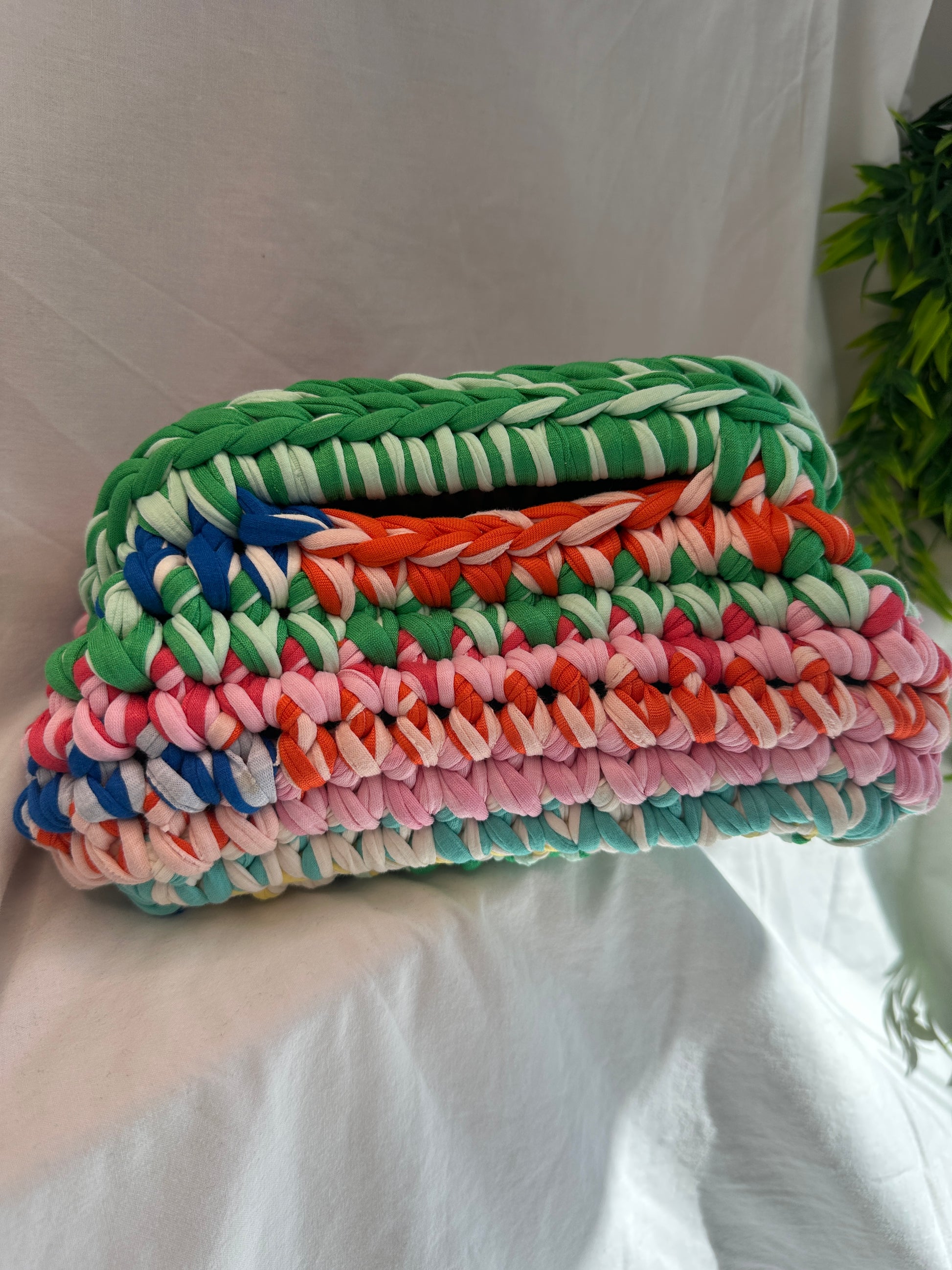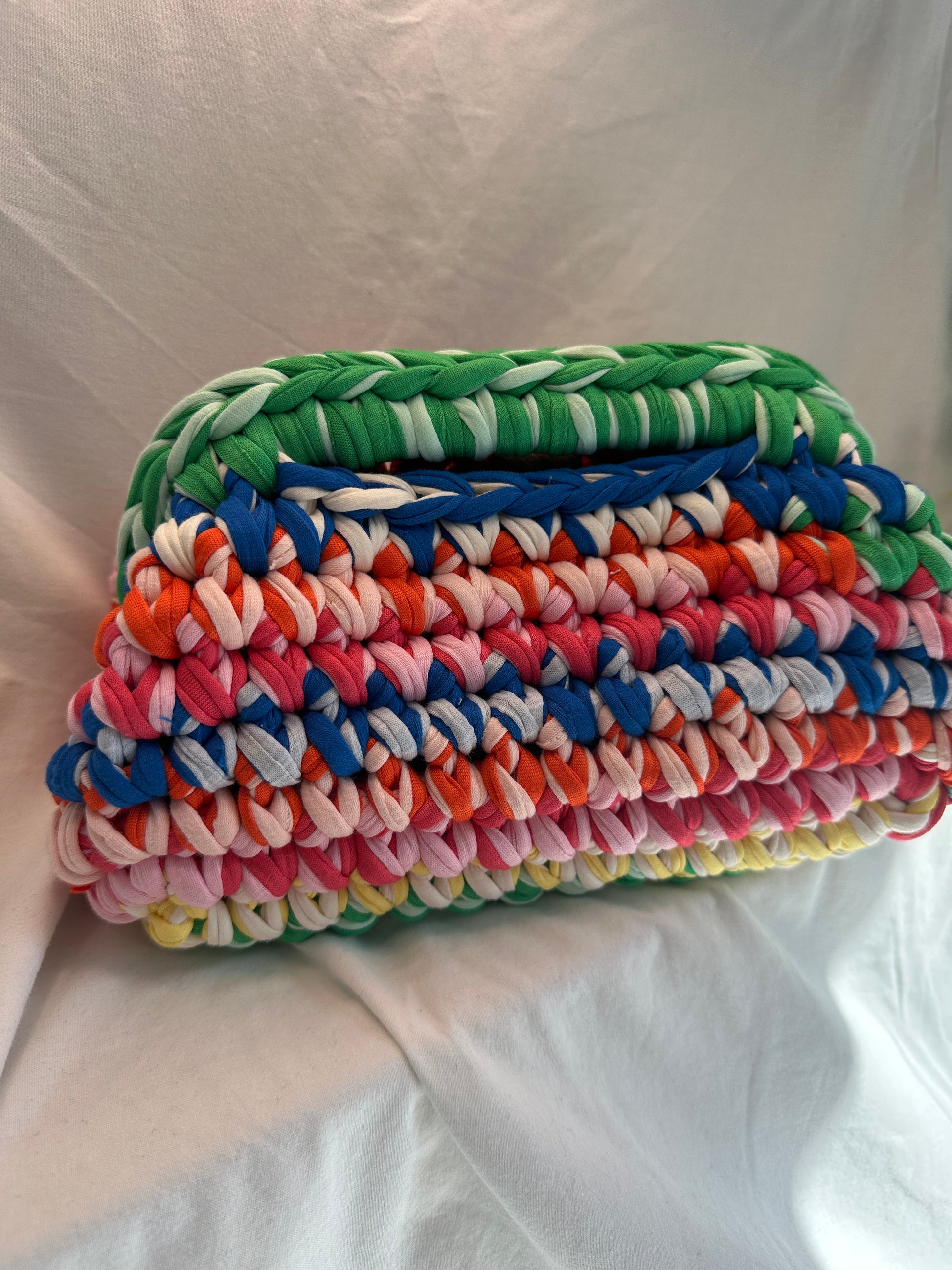 Embrace playful style the Tutti Fruitti clutch, a vibrant explosion of colour. This bag is a joyful mix of juicy oranges, zesty greens, bold blues and candy pinks - the perfect accessory for adding a fun and unforgettable pop of personality to any outfit. More than just a bag - it's a wearable celebration of sustainable style and pure happiness